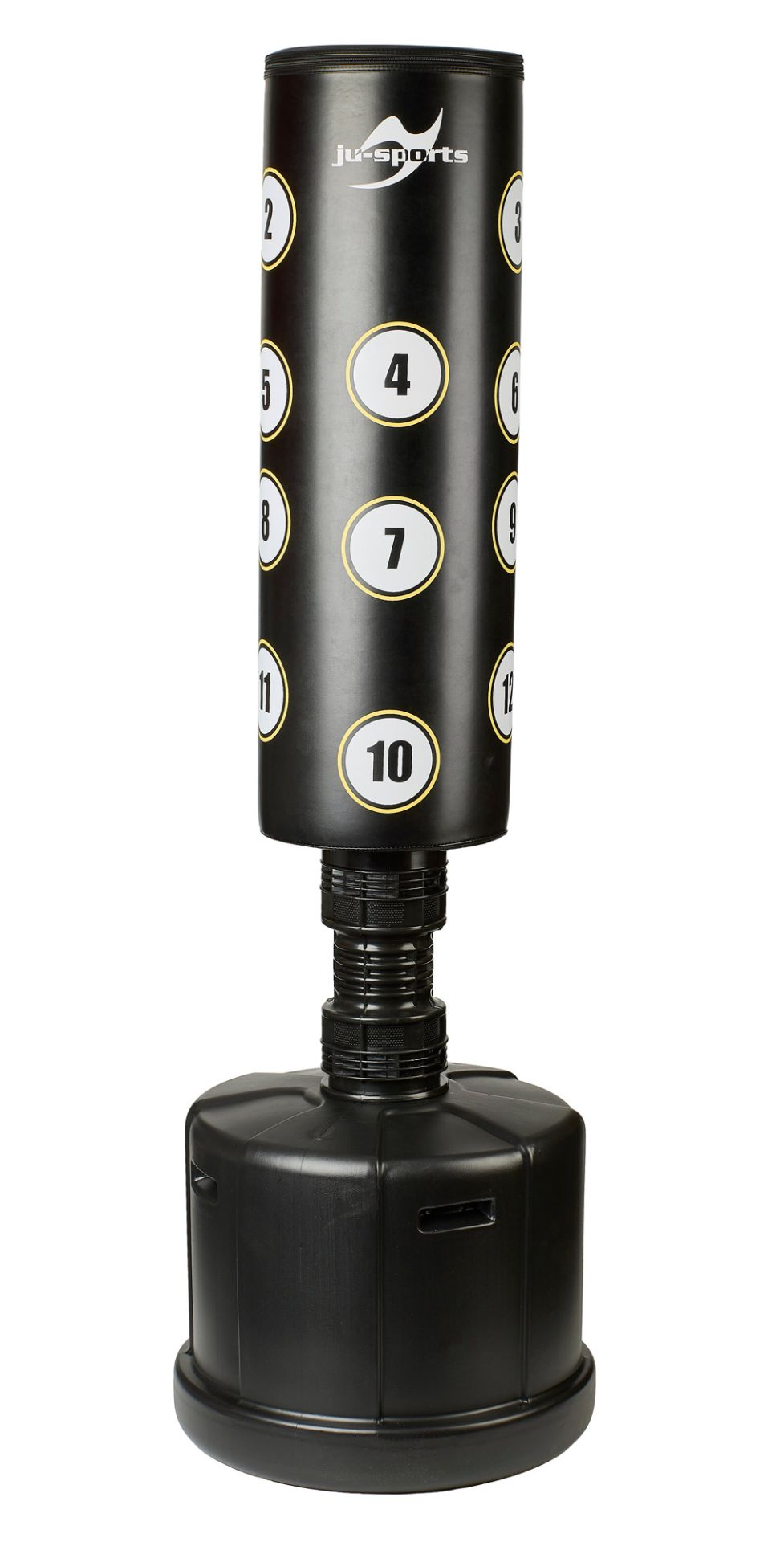 DETAILS: Gesamthöhe ca. 183 cm • Trefferfläche: Höhe ca. 100 cm, Ø ca. 58 cm • Material Trefferfläche: PU-Kunstleder, gefüllt mit Schaumstoff • Standfuß: Kunststoff, befüllbar (Wasser/Sand bis ~100 kg)